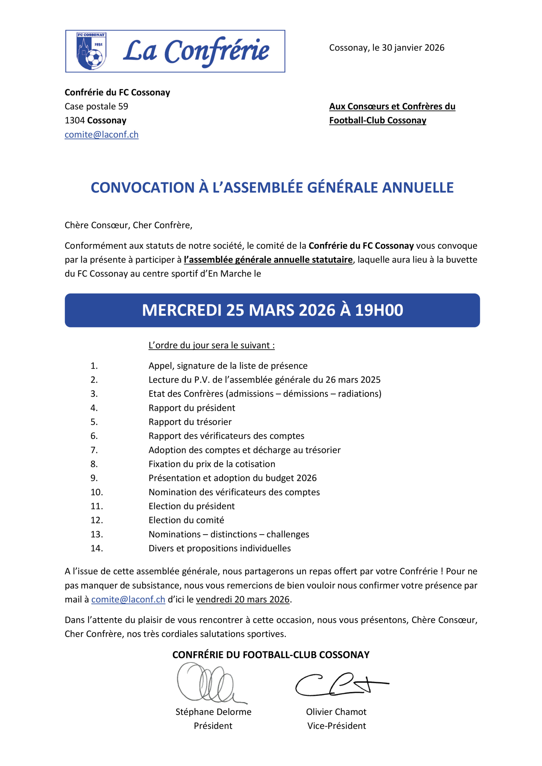 Après plus de dix années passées à gérer le club aux postes de Président, de Vice-président et de Responsable de la subsistance ainsi que de la buvette, Stéphane Delorme, Olivier Chamot et Juan Jové ont fondé en avril 2017 la Confrérie du FC Cossonay afin de soutenir notre Football-Club et de faire perdurer les relations d’amitié entretenues toutes ces années autour de notre club.